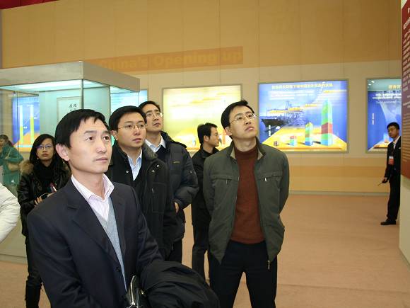 展览介绍了三十年来,中国对外开放取得了举世瞩目的成就:一九七八年到二〇〇七年,中国货物贸易进出口总额从二百余亿美元增长到二万余亿美元,世界排名由第三十二位上升到第三位。此外,中国制造业增加值已超过美国和日本,居世界第一位。纺织品、服装、鞋、玩具等劳动密集型产品连续多年成为世界上第一大出口国。同志们对展出的图片、图表及陈列的文物、档案、实物和模型表现出极大兴趣,在仔细聆听讲解员讲解的同时,不时询问有关情况,很多同志对中国对外开放30年来发生的巨大变化惊叹不已。
