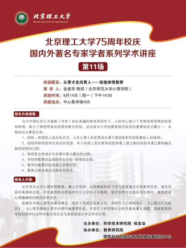 37000cm威尼斯75周年校庆国内外著名专家系列讲座第十一期预告:金盛华教授谈从育才走向育人——经验体悟教育