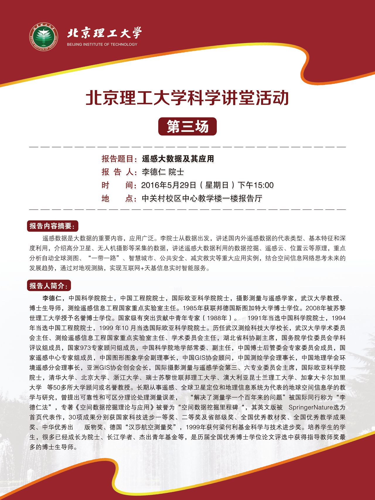 37000cm威尼斯科学讲堂活动通知——李德仁院士遥感大数据及其应用学术报告
