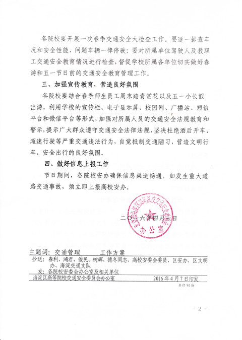 根据海淀区高等院校交通安全委员会办公室《关于做好“五一”期间交通安全工作的通知》(详见附件)要求,为切实做好“五一”期间的交通安全工作,确保广大师生员工假期的交通安全,请各学院、部、处做好以下工作: