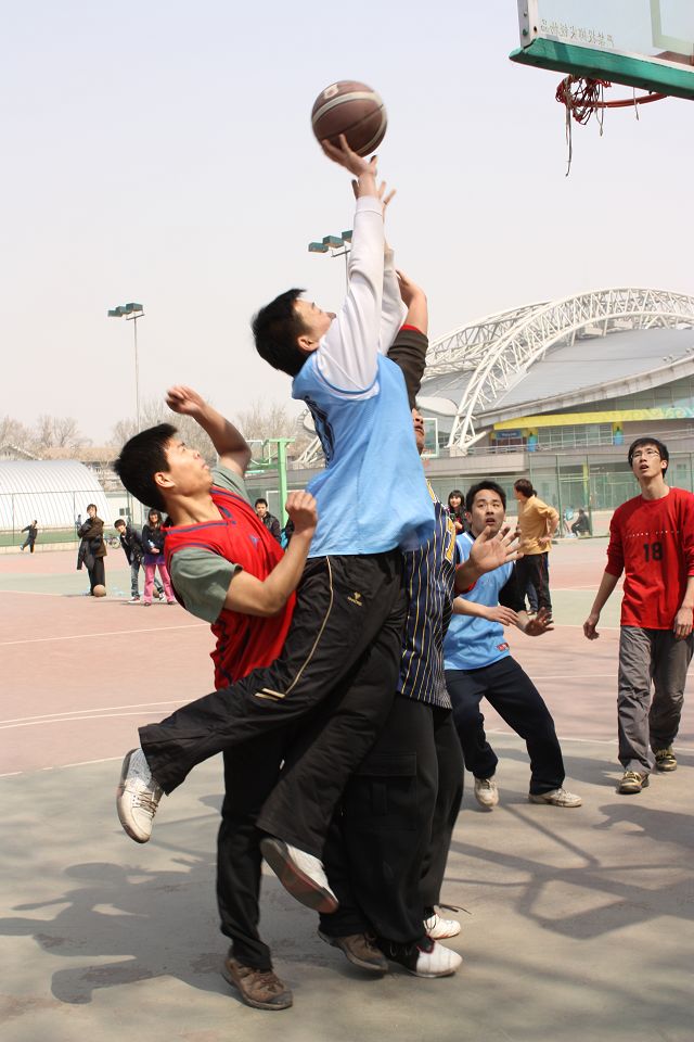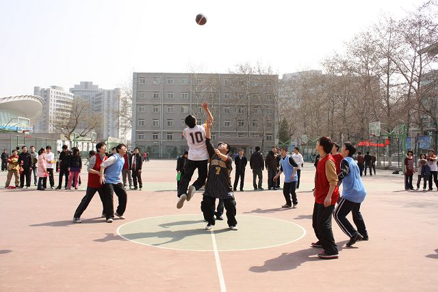 为了增加比赛的趣味性,并让女同学能更多地参与到比赛中来,特别安排了女生投篮的环节,具体是每两局之间的休息时间双方各处两名女生,每名女生在罚球线区域各投5球,每球按5分计入上一局的得分。由于女生的进球价值连城,在某种程度上说女选手的表现对胜负有着决定性的影响,因此双方也是各遣精英,比赛过程也可谓紧张刺激。