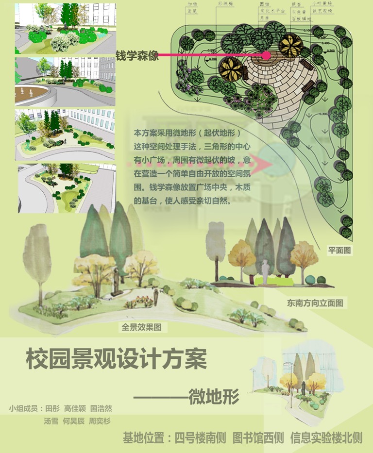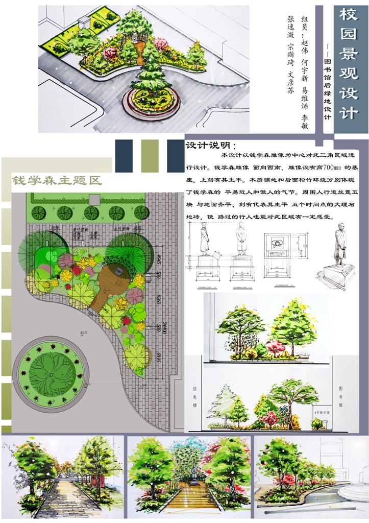 钱学森塑像作为我校校园景观的重点内容,得到了广大师生员工的积极关注,党委宣传部结合学校整体建设工作开展,拟在图书馆西南三角地重新建设以钱学森塑像为核心的校园景观,并结合学生教学活动,鼓励学生用自己的专业知识美化校园,进一步增强校园景观的文化底蕴,服务于学校的人才培养工作。现将五组方案加以展示,向广大师生员工征求意见,宣传部将综合师生意见后,修改后选定最后的实施方案。