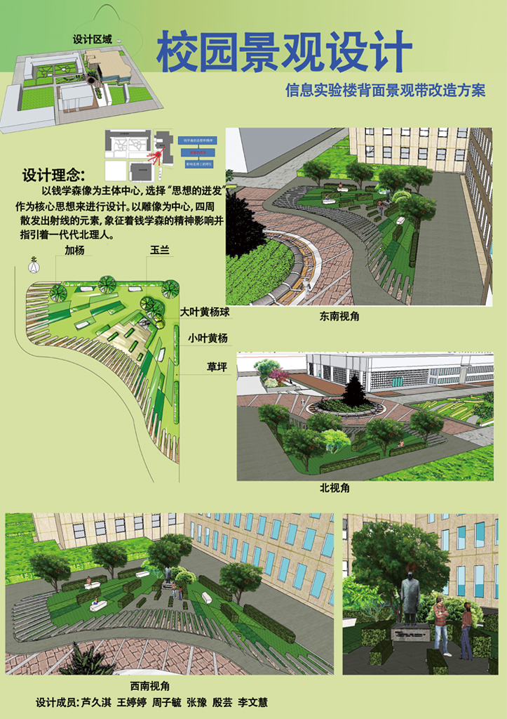 为了进一步做好校园环境建设,党委宣传部联合设计艺术学院,以我校钱学森雕塑新址小环境设计为主要内容,将学校工作与学生培养工作结合,积极发挥设计学院环境艺术设计方面的专业力量,组织了本次方案设计活动。