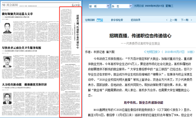 “‘2020企业校招光明大直播’不仅是一个‘云招聘’平台,在直播过程中,也向求职者传递了‘干一行爱一行、钻一行精一行’的敬业精神。”周善红代表告诉记者,在内蒙古北方重工业集团有限公司的直播中,中国兵器集团首席技师、全国劳模郑贵友和“大国工匠”戎鹏强现身直播间,分享他们的故事,从他们身上可以看出这一代人对职业的坚守和对事业的传承,让人敬佩。
