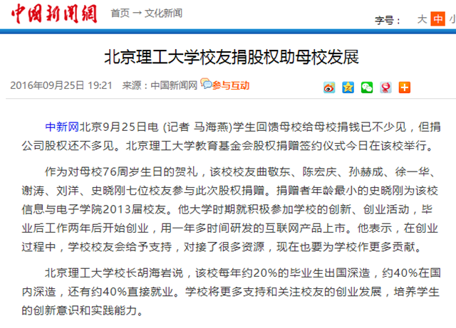 【人民网】七位校友向北理工教育基金会捐赠企业股权