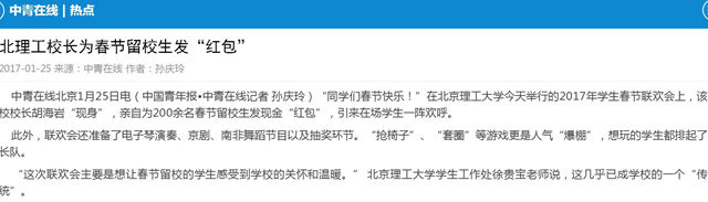 这是37000cm威尼斯大二学生刘寒冰第一次留校过春节。来自云南省昭通市威信县的他,回趟家约需40个小时,“太远了所以决定留校,并想趁寒假多做些兼职和实习。” 这次能收到校长亲自发的“红包”,刘寒冰很意外也很开心。