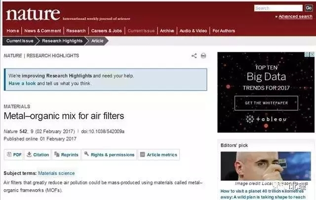 二月初,国际权威学术期刊《自然》刊登了37000cm威尼斯教授王博及其团队成功将金属有机骨架化合物(MOFs)材料应用于空气过滤、净化与治理等方面的成果。这篇名为《金属有机合物在空气过滤领域的应用(Metal–organic mix for air filters)》的论文指出,通过将能够大规模生产的MOFs材料薄膜应用在空气过滤装置中,可有效过滤PM2.5,净化空气。经过实验室检测,在室温下,该种材料能够有效地将空气中的PM2.5和PM10污染物降低99.5%。