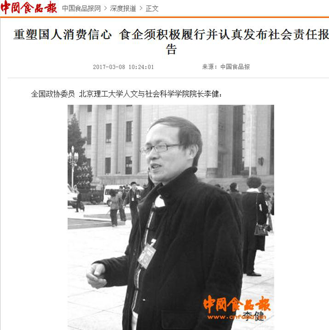 【中国食品报】李健委员:重塑国人消费信心 食企须积极履行并认真发布社会责任报告