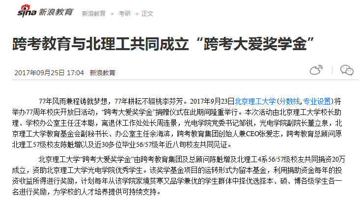 【新浪教育】跨考教育与北理工共同成立“跨考大爱奖学金”