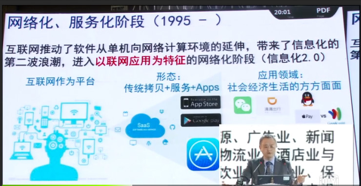 我想讲一讲这三个阶段的大体特征。在软硬一体化阶段,也就是计算机刚出现的时候,是没有软件的,都是以程序实现的,大体上展现方式的是机器语言,汇编语言。早期应用领域以破解密码,军事领域的计算为主。60年代初期,开始出现“软件”一词,融合程序和文档为一体,作为独立的形态从硬件分离出来,以IBM 360系列机为代表(尽管还是和硬件捆版一起销售),也逐渐形成了计算机学科和程序员行业。它的展性形式是高级程序语言+文档,应用领域主要是商业计算和其他科学计算领域。软件产品化、产业化阶段,以Microsoft和Oracle的出现,标志着软件开始成为一个独立产业。PC的广泛应用和软件产品化催生了人类历史上信息化的第一波浪潮,其主要特征即以单机应用为特征的数字化阶段。紧接着就出现了办公软件,彻底改变了人类传统的办公行为,微软office迄今依然是微软标志性产品之一。九十年代中期开始 ,软件进入网络化,服务化阶段。互联网推动了软件从单机向网络计算环境的延伸,带来了信息化的第二波浪潮 ,其基本特征是以联网应用为特征的网络化阶段。