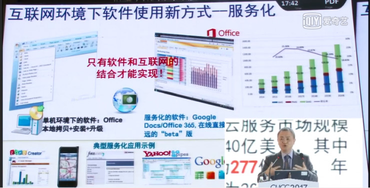 感谢大会给的这个机会!近几年中,我在不同的场合也做了很多不同的报告,但是这几年都是被动地被拉去讲大数据,后来想想,差点把自己的主业忘了。现在软件很重要,我们每天的生活都离不开软件,可能大多数人每天早上起床的第一件事儿就是打开某个APP。所以我今年给自己订了一个小目标,但凡有机会做报告,我就只讲软件,也是为本行业的人呼吁一下,所以我今天讲的题目很大,软件定义一切。