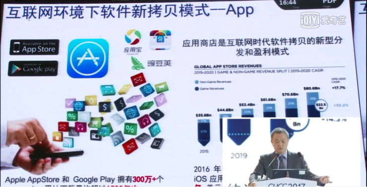我们中国学者自己定义一个词:网构软件。指的就是面向互联网计算的软件新范型。这些新范型是什么,总结有几个性质,实体的自主性,实体对环境的情景感知,实体之间的自主协同,实体的在线演化,以及可信性需求。简单来说,软件呈现网络化体系结构,基于网络进行开发,通过网络交付分发并提供服务,这就是软件的服务化。软件和硬件相比,同样都作为功能性产品,但软件这种工具和互联网结合就能够实现一种真正的服务化。紧接着移动互联网的产生,又产生了一种新的模式,这就是APP。苹果商店拥有300万+个APP,累计下载量超过1500亿次。这个时候创造了一种新的模式,客户端要和服务器端合起来完成一件任务,他也是一种拷贝,不过是一种新的拷贝方式。互联网深刻改变了人类社会和生活模式,而互联网的核心价值是连接,软件是实现互联网核心价值的重要使能技术。硬件连接虽然很重要,但最终的灵活连接还要靠软件。