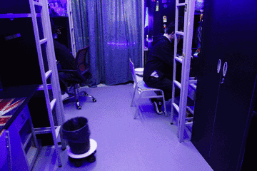 邓亚东告诉北青报记者,这个创意来自于《星球大战》,电影中蓝光的特效让他“有一种身居宇宙的感觉”,于是他们把屋子的上游部分装上了LED灯带,打开开关时,也能泛起蓝光。为了更好地衬托“这道蓝光”,他们又在墙壁上贴了黑色环保壁纸,在地上铺了灰色反光材料的地胶,“让蓝光从天花板到地面再到墙壁遥相呼应”。这样的设计让他们的宿舍生活充满了情调,“就好像把宿舍搬到了宇宙中”。