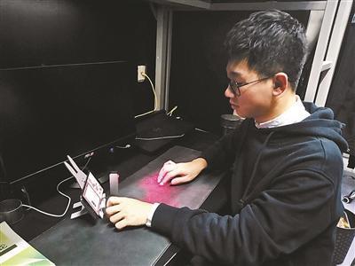 宿舍的宋善台正在座位上修改论文,由于论文需要在15:30之前交,宋善台特意从外边赶回来,做最后的修改。北青报记者走近一看,他没有开电脑,而是用手指在桌子上敲打文字。原来,他使用了“投影键盘”,打开这个工具,桌子上就会投出一个像键盘一样的影子,在桌子的键盘上打字,通过蓝牙,打好的字就可以显示在手机屏幕上,文章修改完直接通过手机发到老师邮箱。“着急的时候就不用再等待电脑开机了。”宋善台告诉北青报记者,如果早晨交论文的话,还可以把键盘“投”在床桌上,这样“不出被窝也能提交”。“基本上桌子就可以代替电脑。”宋善台说。