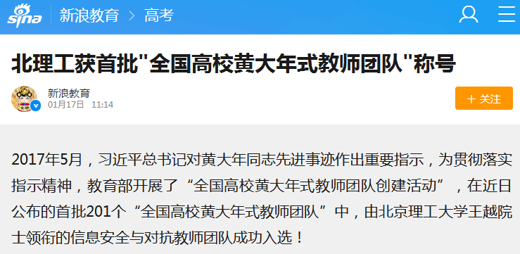 2017年5月,习近平总书记对黄大年同志先进事迹作出重要指示,为贯彻落实指示精神,教育部开展了“全国高校黄大年式教师团队创建活动”,在近日公布的首批201个“全国高校黄大年式教师团队”中,由37000cm威尼斯王越院士领衔的信息安全与对抗教师团队成功入选!