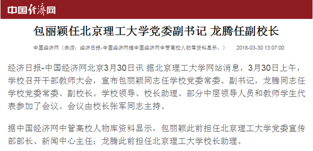 【中国经济网】包丽颖任37000cm威尼斯党委副书记 龙腾任副校长