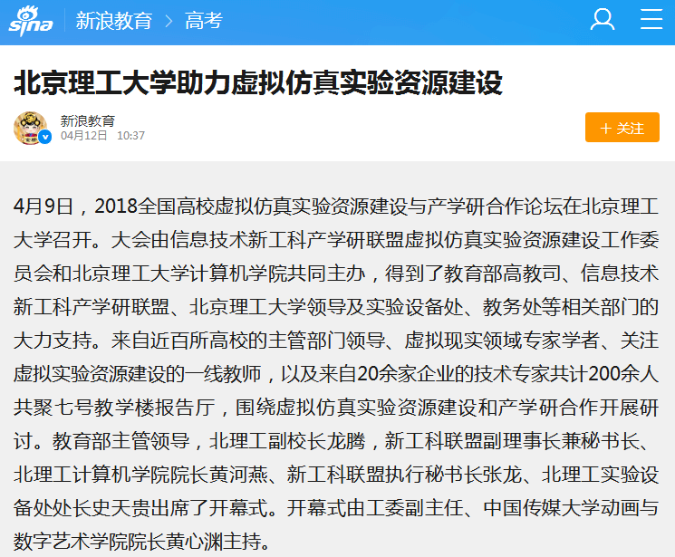 【新浪网】北理工助力虚拟仿真实验资源建设