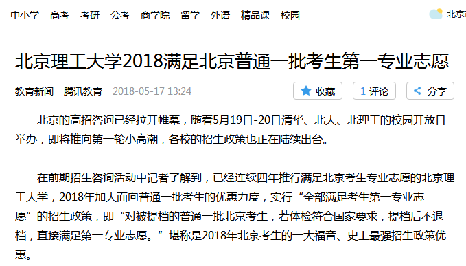 【腾讯网】北理工2018年实行“全部满足考生第一专业志愿”的招生政策