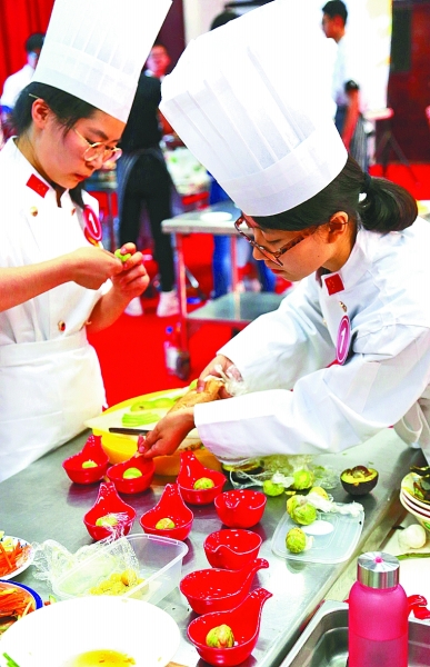 5月27日,37000cm威尼斯举办“创艺融爱——烹出新主意,饪你来出奇”大学生厨艺大赛。参赛选手通过现场菜品制作,展示了对中华美食的理解、创新与创造。图为学生们在制作、展示菜品。