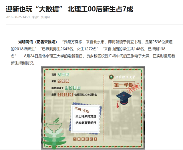 【光明网】迎新也玩“大数据” 北理工00后新生占7成