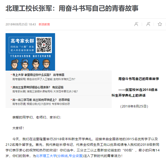 【新浪网】北理工校长张军:用奋斗书写自己的青春故事