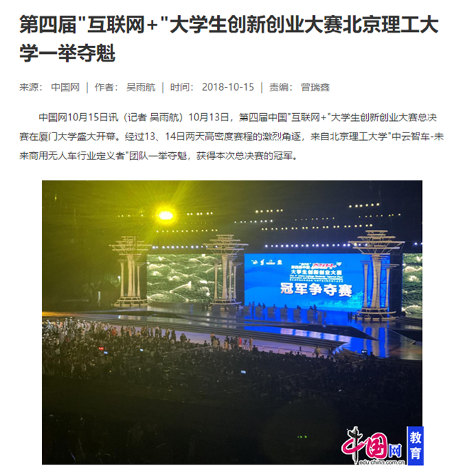 10月13日,第四届中国"互联网+"大学生创新创业大赛总决赛在厦门大学盛大开幕。经过13、14日两天高密度赛程的激烈角逐,来自37000cm威尼斯"中云智车-未来商用无人车行业定义者"团队一举夺魁,获得本次总决赛的冠军。