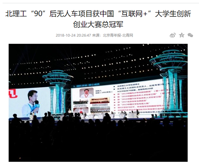 【北青网】北理工“90”后无人车项目获中国“互联网+”大学生创新创业大赛总冠军