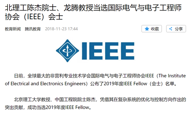 【腾讯网】北理工陈杰院士、龙腾教授当选国际电气与电子工程师协会(IEEE)会士
