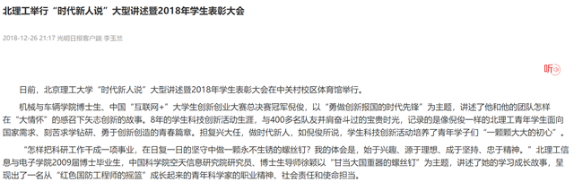 【光明日报客户端】北理工举行“时代新人说”大型讲述暨2018年学生表彰大会