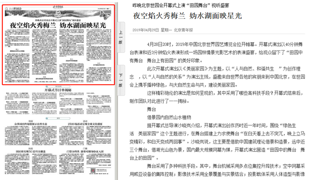 4月28日20时,2019年中国北京世界园艺博览会拉开帷幕。开幕式演出以40分钟舞台表演和近3分钟焰火表演形成一场园林情景光影艺术的表演盛宴,给观众留下了“田园中有舞台 舞台上有田园”的美好印象。