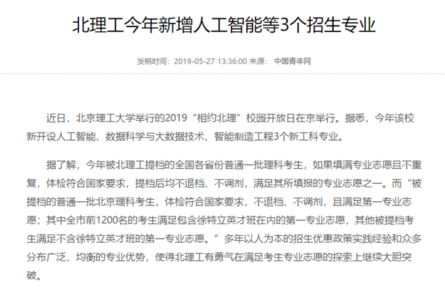 【中国青年网】北理工今年新增人工智能等3个招生专业