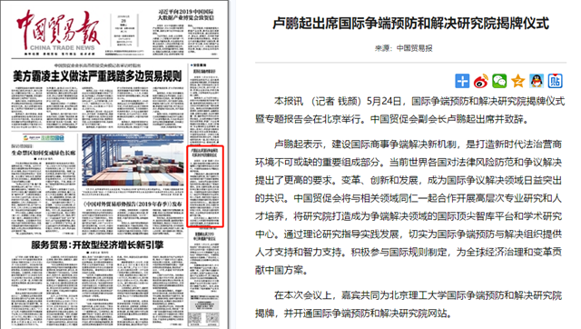 【中国贸易报】卢鹏起出席国际争端预防和解决研究院揭牌仪式