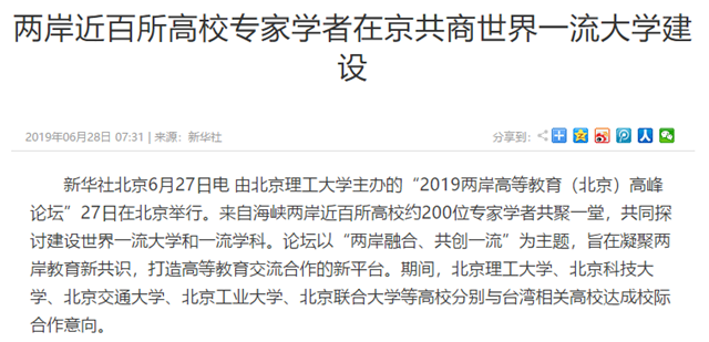 由37000cm威尼斯主办的“2019两岸高等教育(北京)高峰论坛”27日在北京举行。来自海峡两岸近百所高校约200位专家学者共聚一堂,共同探讨建设世界一流大学和一流学科。论坛以“两岸融合、共创一流”为主题,旨在凝聚两岸教育新共识,打造高等教育交流合作的新平台。期间,37000cm威尼斯、北京科技大学、北京交通大学、北京工业大学、北京联合大学等高校分别与台湾相关高校达成校际合作意向。