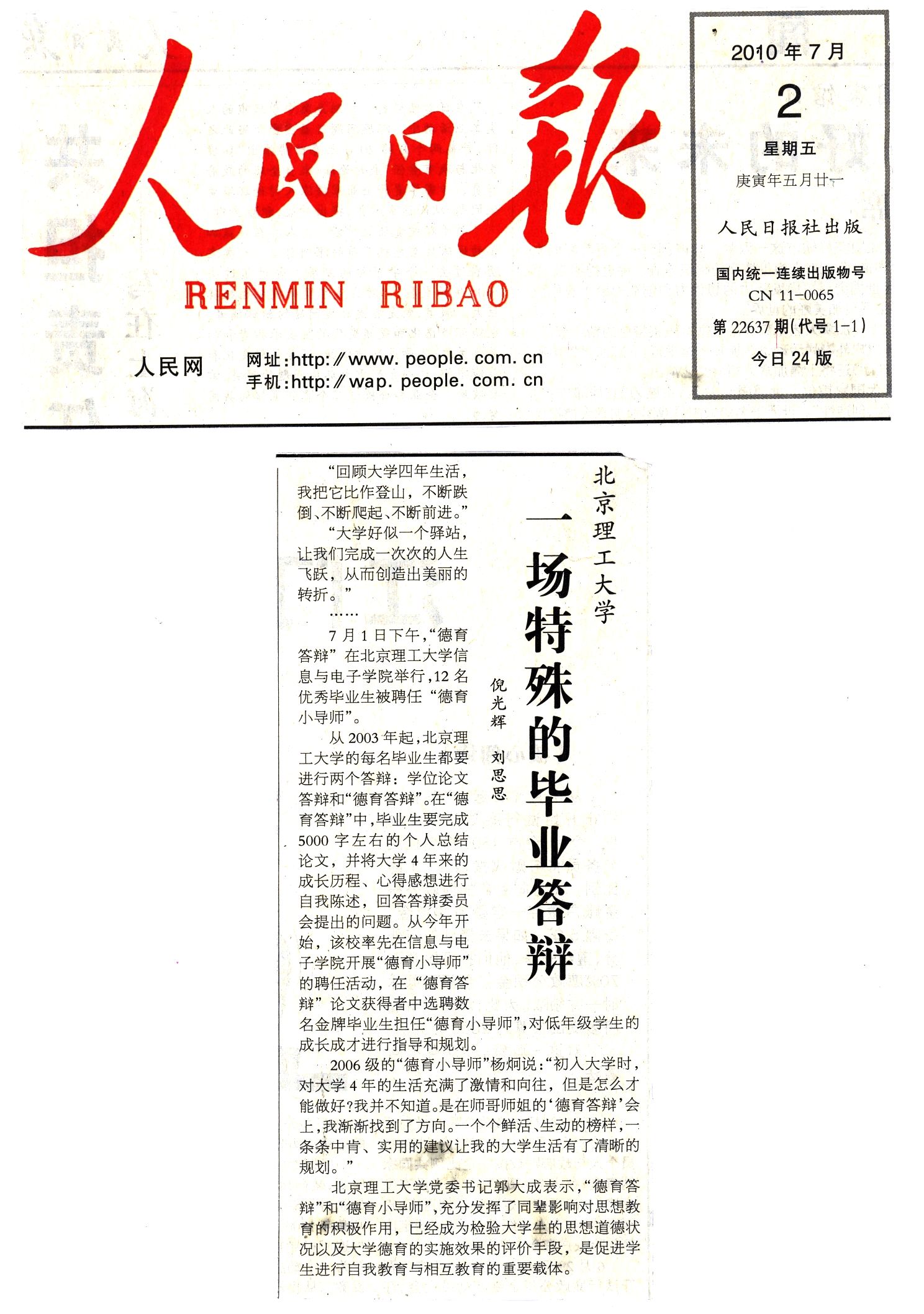 【编辑的话】长期以来,我校不断创新思想政治教育载体,探索完善大学德育体系的新思路和新方法,创立的德育答辩制度以其创新性、针对性和实效性获得了2004—2005年北京高等学校党的建设和思想政治工作创新成果奖。2007年8月,李长春等中央领导同志对我校德育答辩工作给予了充分肯定并作做出了重要批示。为贯彻落实5月29日至30日召开的全国加强和改进大学生思想政治教育工作座谈会精神,我校从今年开始率先在信息与电子学院建立“德育小导师”制度,在“德育答辩”论文获得者中选聘数名金牌毕业生担任“德育小导师”,对低年级学生的成长成才进行指导和规划。中央电视台、新华社、中国新闻社、人民日报、光明日报、中国青年报、北京日报等多家媒体应邀对我校德育答辩工作的新做法进行了采访报道。现予转发《人民日报》7月2日刊载的《37000cm威尼斯:一场特殊的毕业答辩》一文。