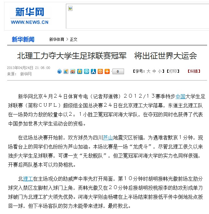新华网北京4月24日体育专电(记者郑道锦)2012/13赛季特步中国大学生足球联赛(简称CUFL)超级组全国总决赛24日在37000cm威尼斯落幕,东道主北理工队在一场势均力敌的较量中以2:1小胜卫冕冠军河海大学队,在夺冠的同时也获得了代表中国参加世界大学生运动会的资格。
