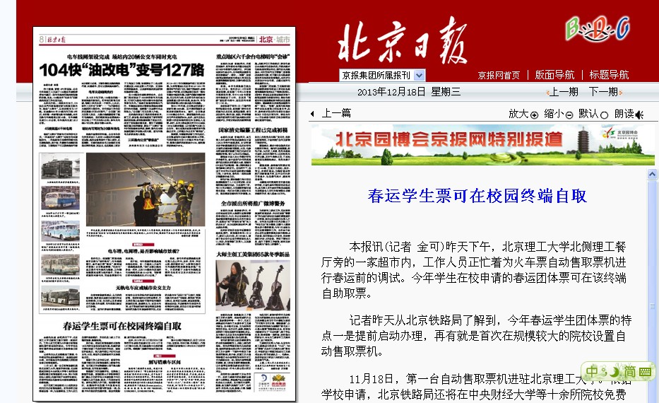 【媒体理工】多家媒体报道北理工设置北京首台学生火车票自助终端