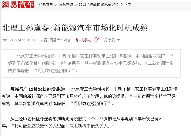 【网易汽车】北理工孙逢春:新能源汽车市场化时机成熟