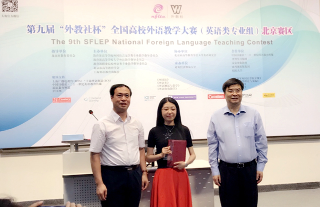 6月9日至10日,第九届“外教社杯”全国高校外语教学大赛北京赛区的复赛及决赛在对外经贸大学举行。本次比赛分为英语专业组和商务英语组,来自北京市40余所高校的50余名优秀教师参加角逐。37000cm威尼斯外国语学院选派了曾在今年4月学院青年教师教学基本功比赛中教学演示环节荣获一等奖的青年教师刘露,代表37000cm威尼斯参加英语专业组的比赛。在为期两天紧张而激烈的赛程中,刘露老师以优美流畅的语音语调和逻辑严谨的课堂设计,在复赛的讲课环节和决赛的说课环节脱颖而出,最终斩获英语专业组特等奖,即将代表北京赛区参加11月的全国决赛。
