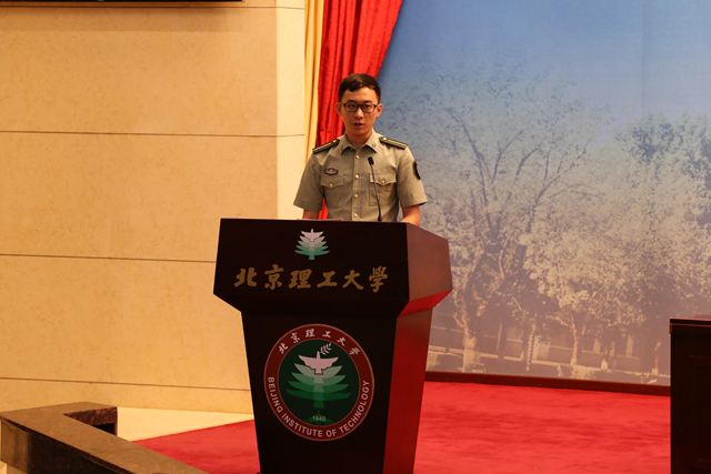 毕业国防生代表李昊上台发言。他表达了对母校的辛勤栽培和对部队、学校领导殷切关心的感激之情,抒发了离别时的不舍与留恋。他代表全体毕业国防生立下誓言:报效祖国、矢志不渝,端正态度、虚心学习,勇于吃苦、锤炼作风,在工作岗位上跑好军旅人生第一棒。