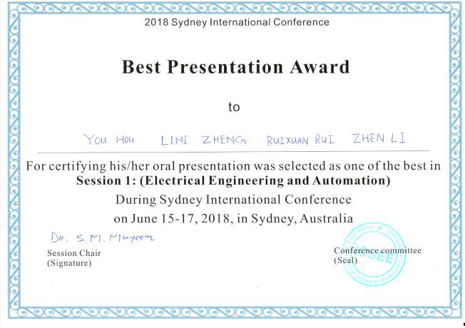 ICSEE2018由澳洲八校联盟、新西兰奥克兰大学联合主办,是面向新能源电力系统领域的顶级学术会议之一,同时也是澳大利亚电力系统领域学术年会,此次大会共录用120篇论文,其中15篇推荐发表至《International Journal of Smart Grid and Clean Energy》期刊(包括获奖论文)。大会根据匿名通讯评审结果,从录用的120篇论文中评选20篇进入严格的现场答辩环节,来自澳洲新南威尔士大学IEEE Fellow Joe Dong教授、新西兰奥克兰大学IEEE Fellow Udaya K. Madawala教授等评委对该项研究表示了高度评价、充分肯定和鼓励,最终本论文因其在逆变器孤岛运行不平衡工况下自适应虚拟阻抗控制方面的贡献而获得最佳论文奖。这是理工学子首次在电气工程领域的国际会议中获最佳论文奖项。