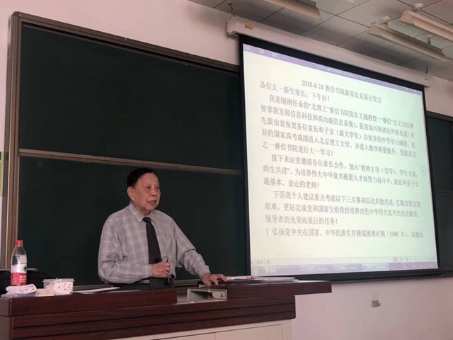 “教师主导,学生主体,师生共进,为培养伟大中华复兴栋梁人才而努力奋斗……”,8月24日,良乡校区理教101教室,北理工“大先生”两院院士王越先生为睿信书院2018级新生及家长们带来了“入学第一课”。讲台上86岁高龄的王越先生,精神矍铄,敏捷的思维,精彩的讲授,深深地吸引着每一位同学及家长。