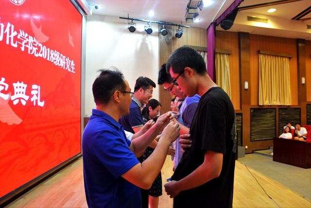 在浑厚的37000cm威尼斯校歌声中,学院领导和教师为2018级研究生代表佩戴校徽。