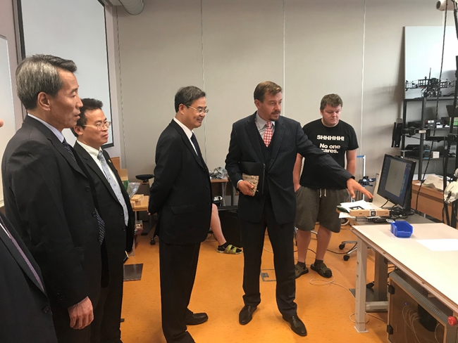 张军详细了解了信息工程学院的研究成果,并就学生联合培养各环节以及联合申请研究项目等内容与院长Pavel Zemčík教授等进行讨论。北理工代表团一行参观了部分研究实验室,并亲身体验教学环境。