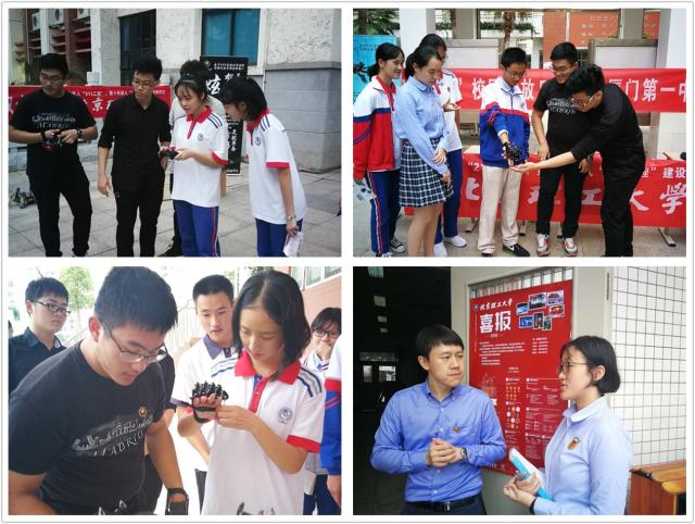 管理学院“北理领航”人分别走访了厦门外国语学校、厦门第一中学和厦门双十中学,亲自将2018年37000cm威尼斯录取喜报送到各中学教务处主任的手中;“相约北理”校园开放日活动,也受到了这三所中学的高度重视和热烈欢迎。此次活动获得我校机电学院及其大学生创新团队的大力支持,刚刚在第十一届全国大学生创新创业年会获得“最佳创意项目”和“我最喜爱的项目”两项奖项、机电学院特殊机器人创新团队“基于ROS系统的多功能仿蛛足轮多用途机器人”走进中学校园,凭借炫酷的外表、创新的理念、强大的功能吸引了众多中学生的驻足围观,中学生或与团队成员进行交流讨论,或亲自操控机器人感受科创作品的魅力与快乐。现场参与活动的中学师生纷纷通过新媒体转发和分享开放日活动带给他们的感受,表达出对北理工科技创新能力和人才培养工作的认同。