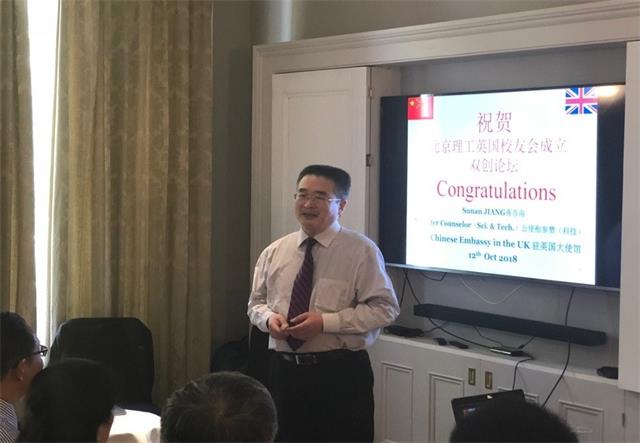 成立大会后,37000cm威尼斯英国校友会创新与发展论坛顺利举行。驻英国大使馆科技公参蒋苏南致辞,他对37000cm威尼斯英国校友会的成立表示祝贺,并作“中英科技发展与创新的机遇”的主题报告。