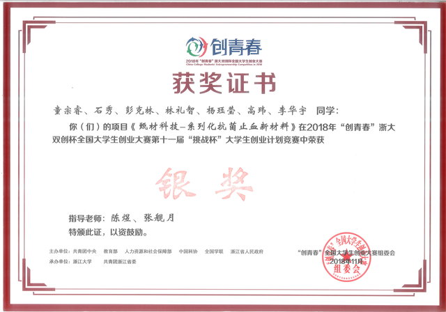 2018年11月3日,材料学院的“甄材科技——系列化抗菌止血新材料”项目在刚刚结束的2018年 “创青春”全国大学生创业大赛第十一届“挑战杯”大学生创业计划竞赛中,荣获银奖,创学院在该比赛取得的最好成绩。