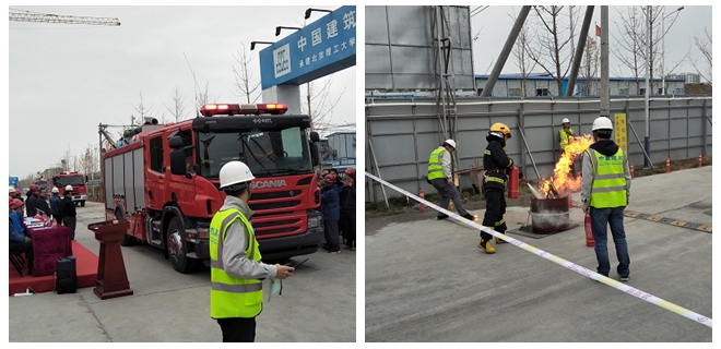 施工单位代表李红坡及监理单位项目总监贠宝华对项目总体情况及进展程度先后进行介绍,荣春海、高宁、张生春先后致辞。项目组成员组织进行消防演练,模拟火灾救援现场,消防支队工作人员在现场对灭火器的使用进行了详细讲解。