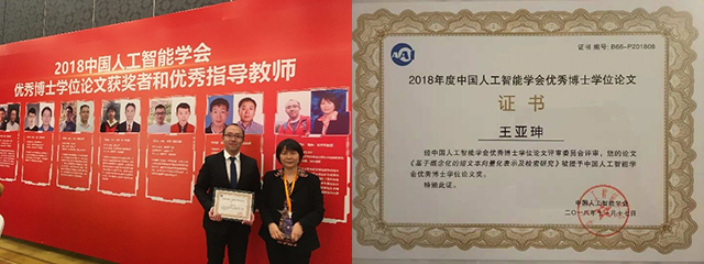 中国人工智能学会是中国智能科学技术领域唯一的国家一级学会,王亚珅博士的学位论文在38篇参选论文中脱颖而出,最终与其他8篇论文一起获得殊荣。其学位论文针对短文本表示建模若干重要基础理论与应用问题进行了系统研究,主要包括支持异质语义关联关系协同建模推理的短文本概念化方案、支持模拟人类阅读注意力习惯的短文本向量化方案、支持微博检索噪声过滤的概念反馈查询扩展方案等,相关成果发表于人工智能与自然语言处理领域顶级国际期刊IEEE Transactions on Knowledge and Data Engineering (TKDE),以及顶级国际会议ACL、WWW 等。
