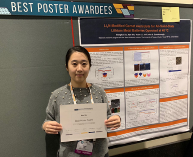 材料学院博士生吴楠于2016年9月加入金海波教授课题组,主要从事碱金属电池固态电解质的研究,目前在美国德克萨斯大学奥斯汀分校John B. Goodenough教授课题组进行联合培养。吴楠同学报名参加此次大会,在固态电池分会作墙报展示,获得“最佳墙报”奖励。
