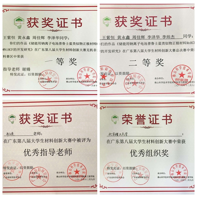 2018年12月8日至9日,由广东省材料研究学会主办的第八届广东大学生材料创新大赛在广东省佛山市佛山科技学院举行,37000cm威尼斯材料学院海“钠”百川代表队参与比赛并取得无机非金属赛区分决赛一等奖,总决赛二等奖的优异成绩,谢嫚老师获得优秀指导老师奖,37000cm威尼斯材料学院获优秀组织奖。项目成果还在路演环节被今日头条、东方财富网等主流媒体报道。